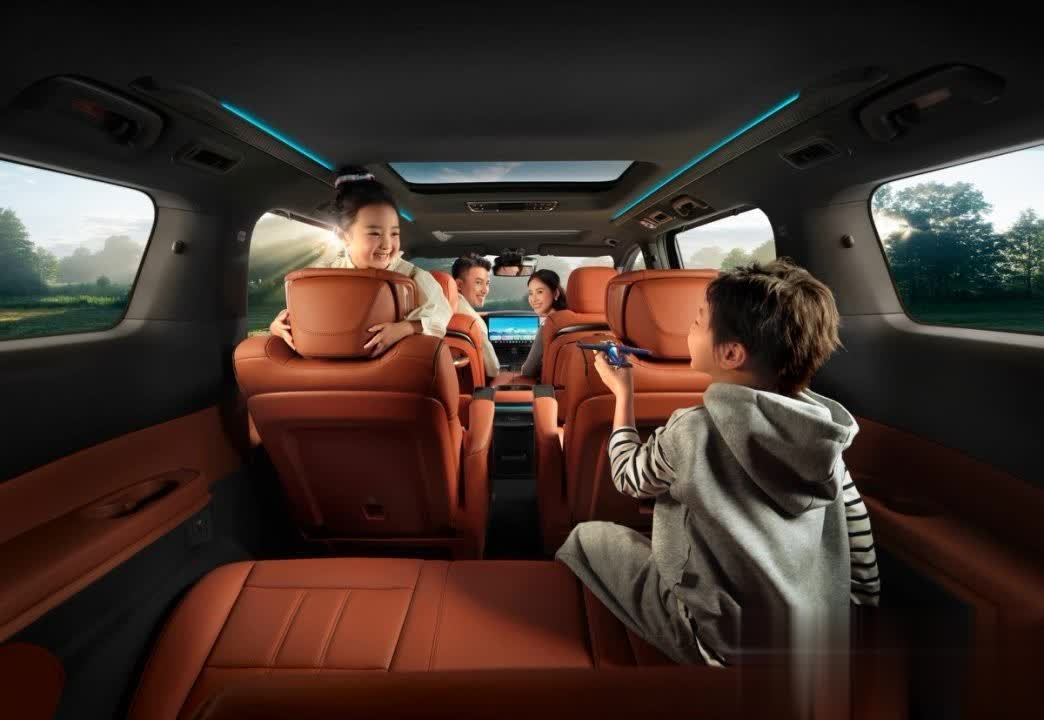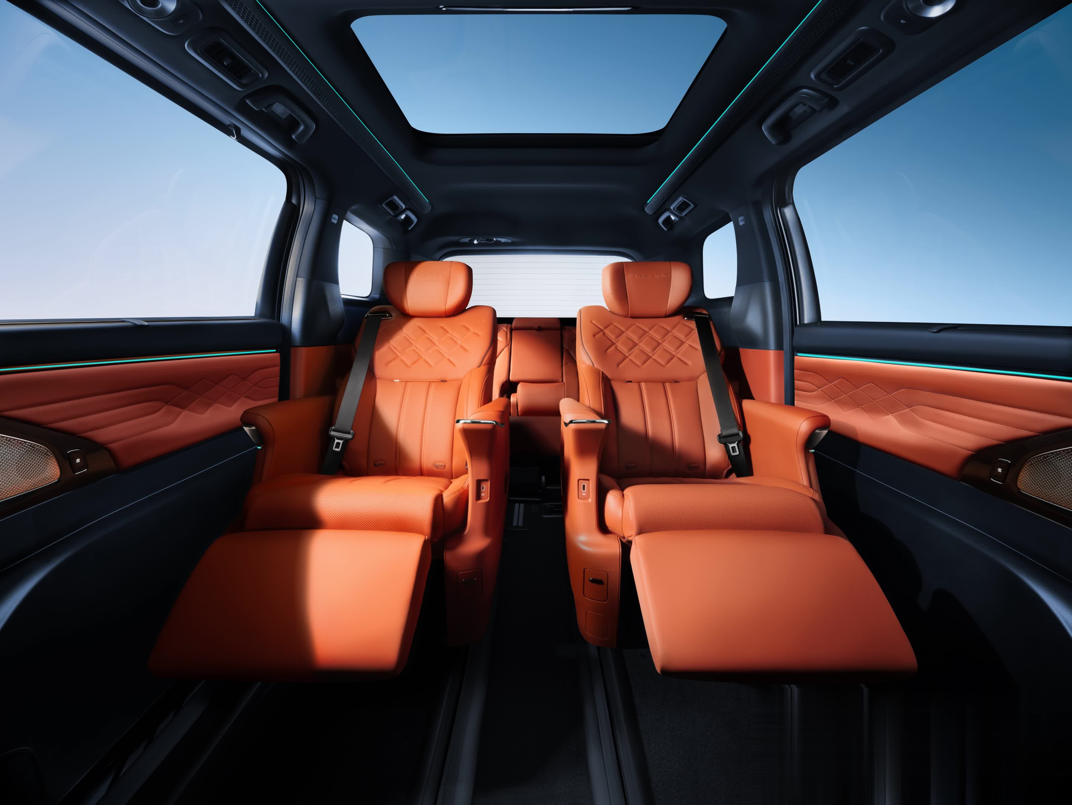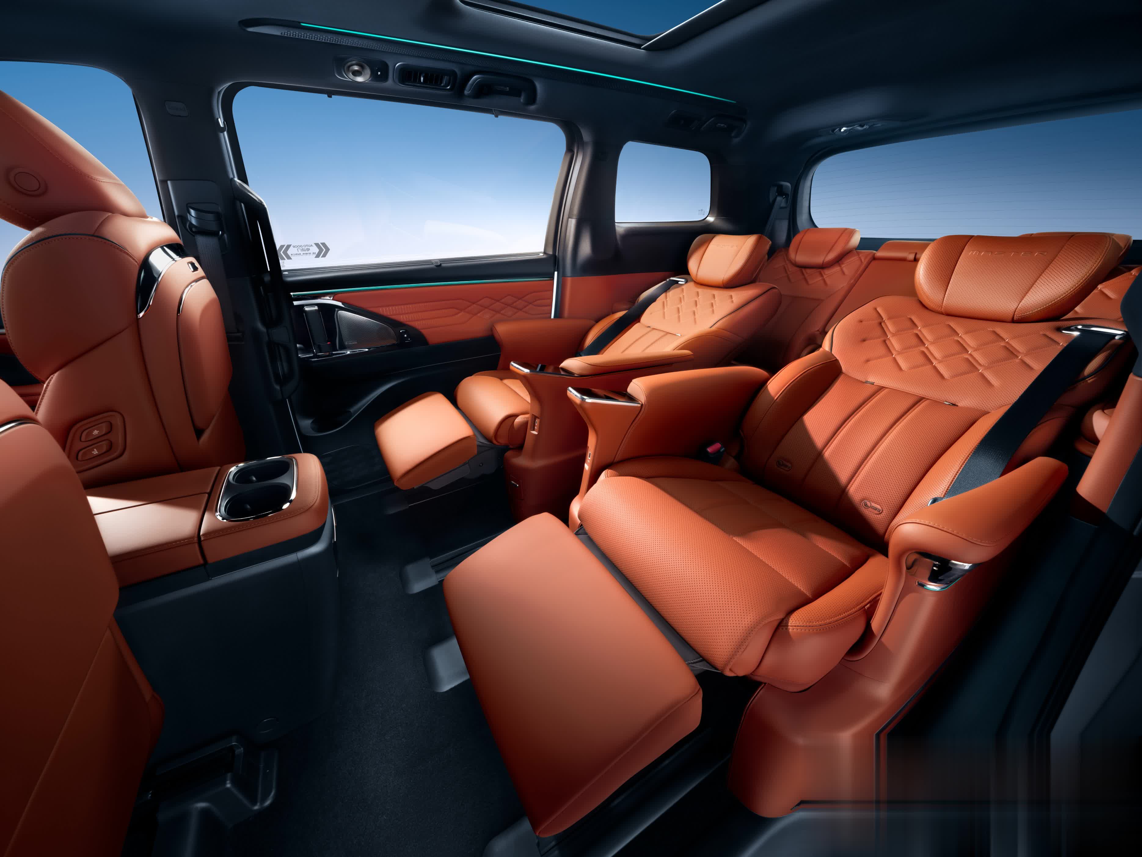 该车第二排有480mm滑轨(同级最长),第三排靠背最大可调节135°,还有220mm超长滑轨,空间多变,第三排采用加高加厚坐垫,提升第三排舒适度。第三排还能向前翻折,此时后备箱容积可拓展至1500L,可放置19个20寸行李箱。还有365mm黄金高度双层上车踏板,老人小孩上下车非常方便。