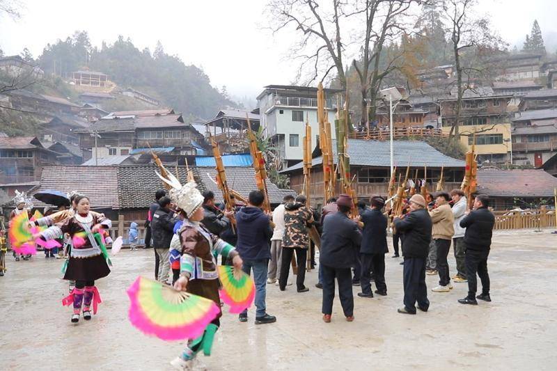 芦笙踩堂。1月20日,尽管气温骤降、寒风凛冽,融水苗族自治县杆洞乡党鸠村乌英屯却暖意融融、欢声满谷,一场热闹非凡的苗年活动在这里火热上演。来自周边各村屯的群众身着盛装、欢聚一堂,载歌载舞共庆佳节,用质朴的方式诉说着苗寨的团圆喜悦。